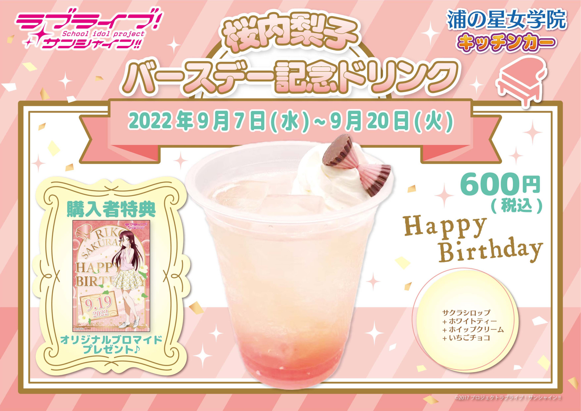 下記期間でバースデー記念ドリンクメニューの販売、記念ドリンク購入者様への特典ブロマイドお渡し、メッセージボードの展示をいたします。