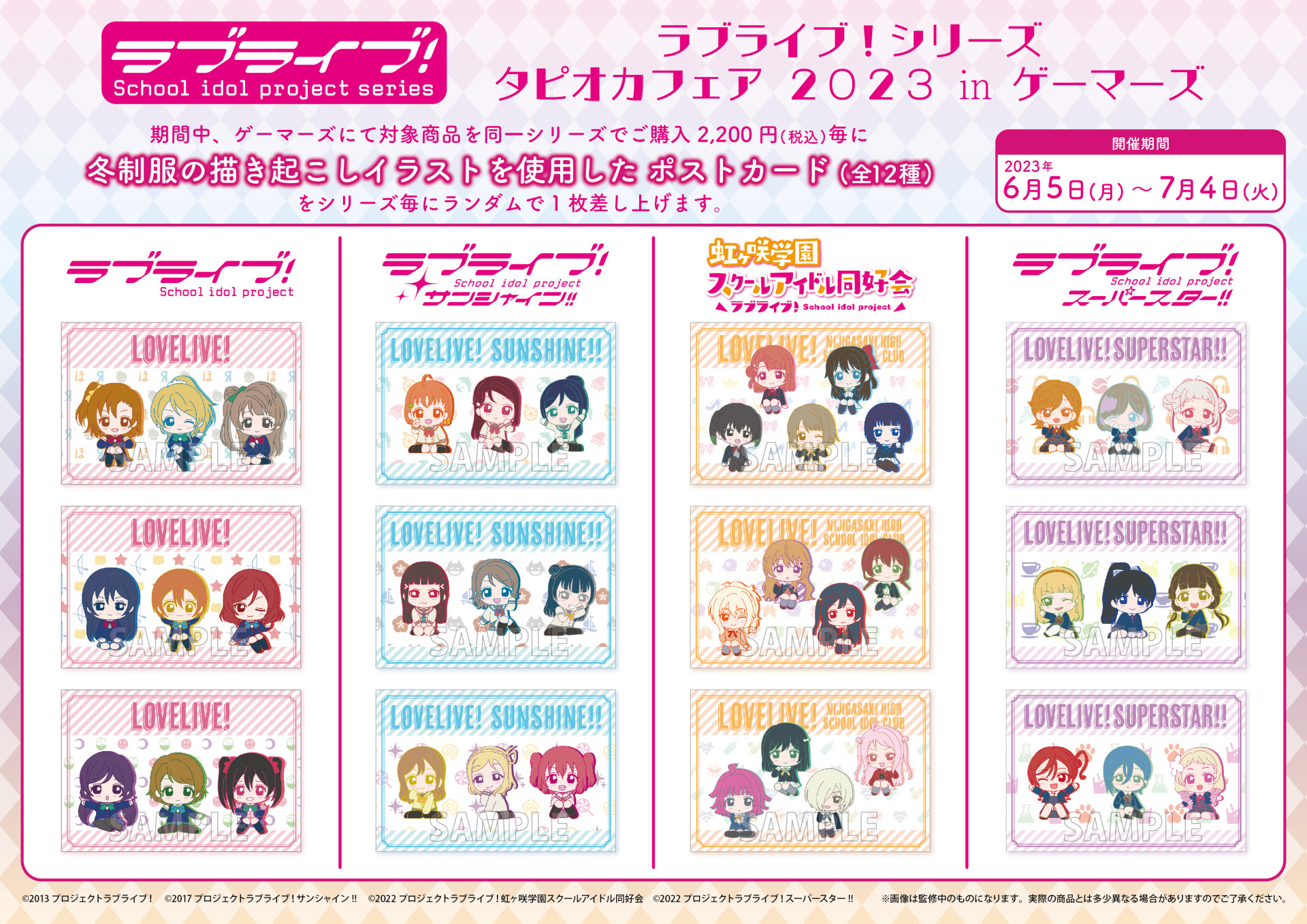 期間中、「ラブライブ!シリーズ」関連の書籍・キャラクターグッズをご購入・ご予約内金1,100円(税込)毎、グラッテ商品(ラテ・クッキー・有償特典アクリルコースター)をご購入1点毎、CD・BD・DVDをご購入1本毎にブロマイド(全9種)を1枚プレゼント!
