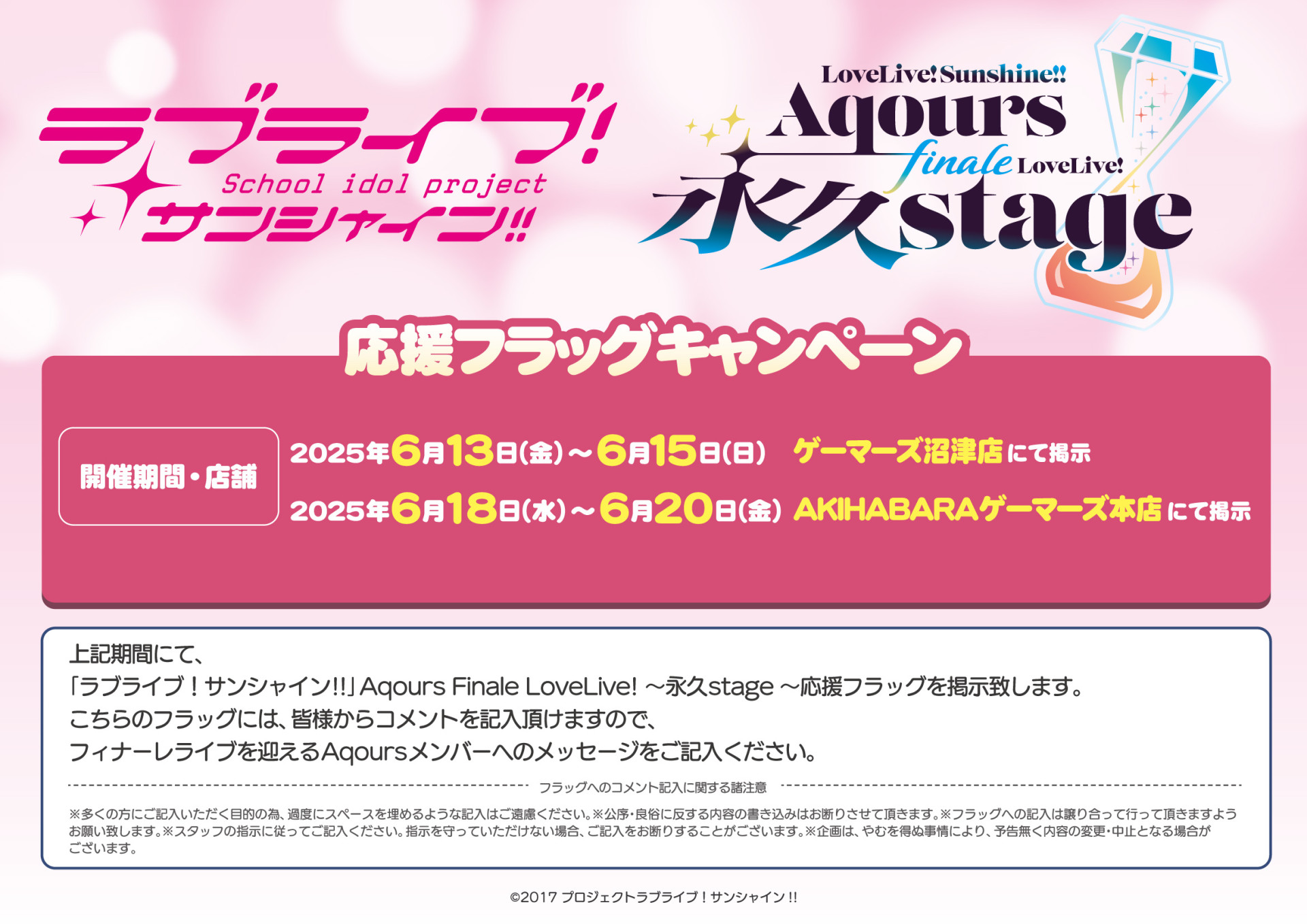 「ラブライブ!サンシャイン!! Aqours Finale LoveLive! ~永久stage~」のCD/DVD/Blu-ray/書籍 物販ブースにつきまして、物販を安心してご利用いただくために、一部時間帯において事前抽選整理券をお持ちのお客様のみのご案内とさせて頂きます。