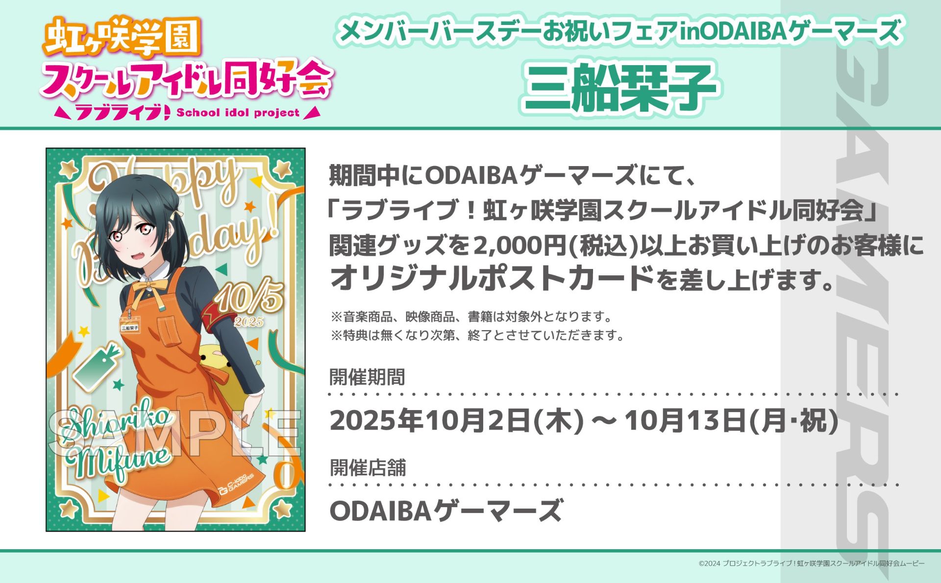 ODAIBAゲーマーズより「ラブライブ!虹ヶ咲学園スクールアイドル同好会」メンバーバースデーお祝いフェア開催のお知らせ